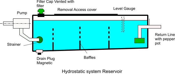 Oil Reservoir The design of the reservoir should be of sufficient capacity to contain all of the fluid in the hydraulic system with at least a 10% excess margin. For static hydraulic transmission systems the reservoir capacity of about 6 x the pump flow/minute should be available. On mobile units it is often necessary to have a smaller reservoir. The construction of the reservoir is generally based on a simple rectangular box with a floor sloping down to a drain plug. The tank should have internal corners suitably designed to ensure convenient cleaning and the surfaces should be desecaled and painted with a paint which is corrosion resistant and suitable for the oil contained. The tank should include a sealed lid which includes a Filler/breather cap with air filter included and a sight level gauge on the side.