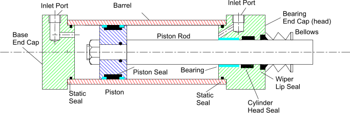 Double acting cylinders are the most commonly used hydraulic cylinders. The pressure can be applied to either port providing force in extending and retracting. The force in extending the cylinder is generally greater than the retracton force. This difference in effective area is in turn caused by the area of the rod that reduces the piston area during retraction. Since more fluid is required to fill the piston side of the cylinder during extension, the operation is understandably slower. During the retraction operation, the same amount of pump flow will retract the cylinder faster because of the reduced fluid volume displaced by the rod. Construction The cylinder consists of five basic parts: two end caps (a base cap and a bearing cap) with port connections, a cylinder tube ( barrel ), a piston and the rod itself. This basic construction provides for simple manufacture as the end caps and pistons remain the same for different lengths of the same diameter cylinder. The end caps can be secured to the barrel by welding, through tie rods or by threaded connections. The end caps are generally made of cast iron or cast aluminum and incorporate threaded entries for ports.