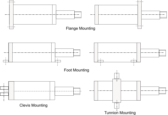 Mounting The mounting of the cylinder on the equipment is a very important factor. The mounting can arranged to support the cylinder along the line of force e.g flange mounting - this providing a rigid mounting. The cylinder can also be mounted outside the line of force e.g foot mounting . In this case the strength of the mounting should be sufficient to cater for the imposed moment. The mounting may be along the line of force allowing angular movement e.g trunnion of clevis mounting. This type of mounting is best when the force moves in an arc.