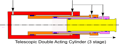 Telescopic cylinder The length of an hydraulic cylinder required to provide a sufficient stroke is sometimes too muuch for the space available. The installation length of a closed cylinder being is the total of the stroke plus the total length of the thickness of the piston, and ends For these cases telescopic cylinders are used . Telescopic cylinders are multi-stage units of two, three, four, five or more stages. In general telescopic cylinders are much more expensive than normal cylinders. Most telescopic cylinders are single acting (push). Double acting telescopic cylinders are specially designed and manufactured.