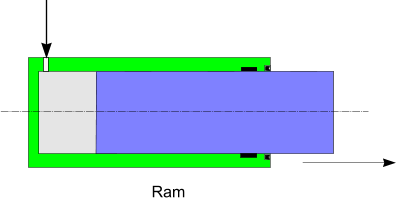 Introduction Hydraulic Cylinders are used to convert the pressure of hydraulic fluid to high force linear movement. At one end of the range of cylinder applications are small single acting cylinder of 10mm dia and 10 mm stroke, available for jig positoning and clamping. At the other end rams are available providing forces of many 1000 tonnes. The note sbelow are outline in nature to provide a basic understanding of the type and construction of hydraulic cylinders. Links are provided to hydraulic cylinder manufacturers with sites providing much more detailed information. Basic Calculations for obtaining the stroke force and speed of hydraulic cylinders are found on my webpage. Hydraulic Calcs For many applications the hydraulic actuator which provides the linear movement is a cylinder. This provides motion by extented or retracting the motion of a piston, or ram, within a cylinder. The movement of the piston /ram out of the cylinder is usually the power stroke . For long stroke cylinders the limitation of the power stroke will be its strength of a member as a strut. Generally the retraction motion is not loaded. Types of Hydraulic Cylinders The simplest linear actuator is a Ram. Rams are generally used in applications for moving vertical heavy loads although horizontal Rams are used when suitable guides rods are provided to guide the motion. Ram-type cylinders are available for long strokes and are used on jacks, elevators and automobile hoists.