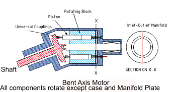 Bent Axis motors. Bent axis piston motors have a rotating cylinder containing parallel pistons arranged radially around the cylinder centre line. The pressure in the fluid causes the pistons to reciprocate over a stroke based on the relative angle of the shaft and cylinder. The motion of the pistons results in the rotation of the shaft. The cylinder is driven by an shaft which is arranged at an angle to the cylinder axis. The shaft includes a flange with a mechanical connection to each piston. The greater the angle of the cylinders to the shaft axes the longer the pistons stroke and the less the rotation speed per unit fluid flowrate.