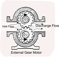 Introduction Below are identified various types of positive displacement motors with notes identifying operating information. These notes and sketches are rudimentary in nature and are provided to show the principles involved in the designs. For detailed notes on the design and performance it is advised the the manufacturers literature is referenced. Basic Calculations relating motor fluid flow, power and, shaft torque are found on my webpage. Hydraulic Calcs External Gear Motor The motor includes two gears one gear is includes the drive shaft. The motor bearings are generally provided with internal bearings and packed glands or mechanical seals. The most popular gear types are straight spur. These can be noisy and subject to vibration if they are not manufactured to high standards.
