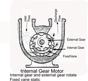 Internal Gear Motor The pump is based on an external gear located within, and meshing with, a larger internal gear. A crescent vane is included to seperate the inlet volume from the discharge volume between the two gears. The hyddraulic fluid enters enters the inlet volume and the pressure tend to expand the volume which results in the gears rotating. At a certain point in the rotation the volume is connected to the outlet port and as the gears continue to rotate the fluid is force out to the discharge route. the.