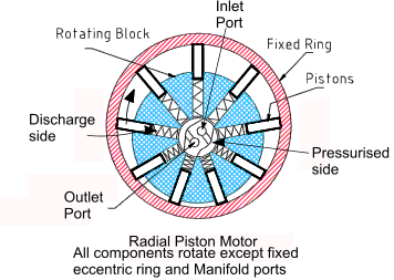Piston Motors General Notes The motors are extensively used for power transfer applications in the off shore , power transmission , agricultural, aerospace and construction industries,.. to list just a few. All of these motors work on a similar principle. Radial Piston Motor. Radial Piston motors include a rotating cylinder containing equally spaced radial pistons arranged radial around the cylinder centre line. A springs pushes the pistons against the inner surface of an encircling stationary ring mounted eccentric to the cylinder. The fluid flow at pressure causes the pistons to move out,resulting in rotation, for half of a revolution and the pistons move in ,driving the fluid out during the other half. The greater the ring eccentricity the longer the pistons stroke and the less the rotation speed per unit fluid flow rate.