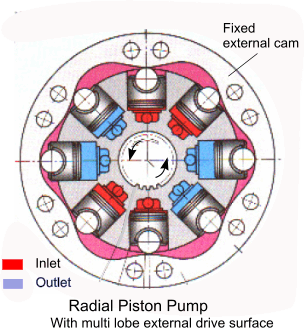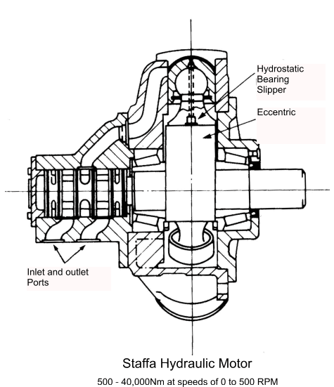 A variation of the radial piston motor is the Staffa motor as shown below. For this type of motor the radial pistons are arranged in the outer case and move against an eccentric section of the rotating shaft. This motor is produced in a number of sizes enabling high torques at low speeds.