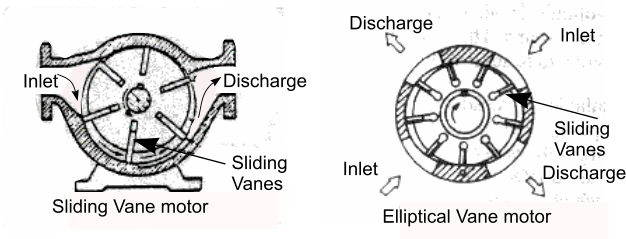 Sliding Vane Motors The vane motor includes a ring mounted inside a cylindrical case The ring includes a number of radial slots in which are located sliding vanes. The ring is mounted eccentric to the case and the vanes are designed to press against the inside wall of the case. The vanes are forced against the wall by hydraulic pressure or spring force or due the centrifugal force resulting as the ring is rotated.