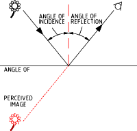 Light waves , radio waves and X-Rays, and gamma rays are all types of electromagntic waves. Luminous Flux = 4 . p luminous intensity. Note : ![]() The flux of a 1 cd source results in a luminous intensity of 1 lumen/ steradian. The definition of liminous flux is ;- Luminous Flux = F = I . Ω The illumination (E) of a surface is the liminous flux per unit area that reaches the surface. The unit of illumination is the lux (lx). Illumination E (lx) = F (lm) /A (m2) Reflection of LightWhen a beam of light is reflected from a reflective plane surface the angle of reflection equals the angle of incidence. The image has the same shape and size as the object but with left and right reversed. The image is perceived to be the same distance behind the mirror as the object is in front. ![]() Refraction of Light The velocity of life is different in different mediums. When a beam of light passes from one medium to another at an angle its direction changes. The greater the differences in the velocity of light in the different mediums the greater is the angle. Index of refraction = n = c/v Snells Law = Sin i/Sin r = v1 / v2 = n2 / n1