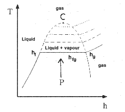 A typical plot which can be produced using the tables is shown below for the T vs h. Similar plots could be produced for v. s. and u. The critical point C at which the there is no difference between the liquid and gaseous phase is at 221.2 bar and 374.15 oC.
