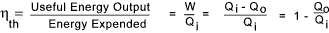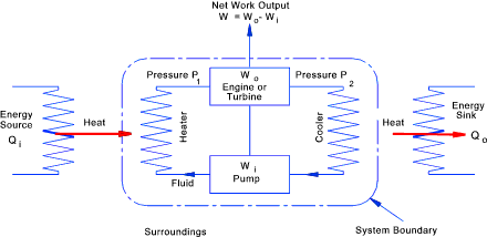 For the typical heat engine, as shown, the working agent is assumed to complete a cyclic process. There is no net gain or loss of energy within the boundary (Δ E = 0). This is in accordance with the First Law of Thermodynamics or the law of conservation of energy. Qi + Wi = Qo + Wo Also the net work done by the engine is equal to (the work out - the work expended ). W = Wo - Wi.....= Qi - Qo The efficiency of the heat engine is the ratio of the useful work output and the energy input i.e.