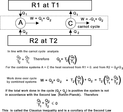 This principle can be tested by considering a system A which completes a complete cycle receiving heat Q1 from heat source R1 and heat Q2 from source R2. In accordance with the first law the work done by A over a complete cycle = Q1 + Q2. This system can now be isolated from the heat sources. A second system C is provided which then completes a Carnot cycle which is arranged to reject Q1 to the heat source R1 and receive heat Q2from R2. The carnot engine can be adjusted to match the conditions by setting of the isotherms and if necessary by having multiple cycles