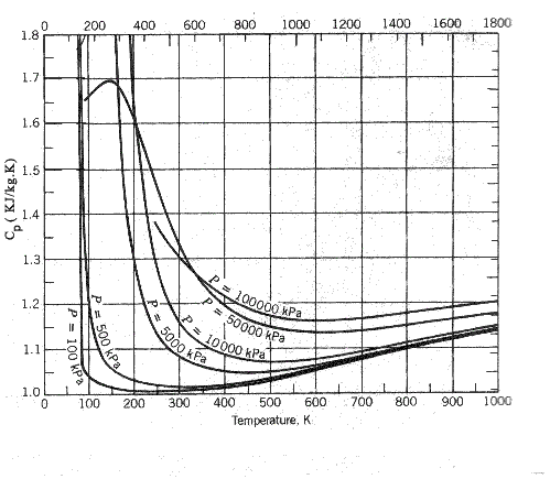 The specific heat varies with temperature and pressure. The graph below this illustrates this characteristic for cp. for air