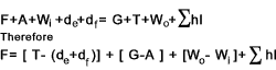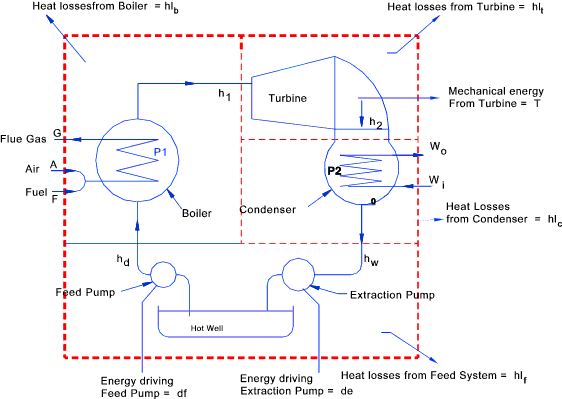 Boiler F + A + h d = h 1 + G + hl b hence F + A = G + h 1 - h d + hl b Turbine h 1 = T + h 2 + hl t hence 0 = T - h 1 + h 2 + hl t Condenser Unit W i + h 2 = W o + h w + hl c hence W i = W o + h w - h 2 + hl c Feed Water System h w + d e + d f= h d + hl f hence d e + d f = - h w + h d + hl The four equations on the right can be arranged to give the energy equation for the whole turbine system enclosed by the outer boundary