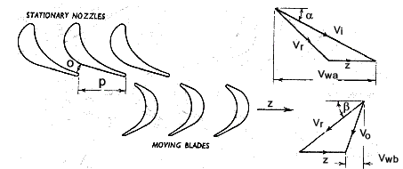 z represents the blade speed , V r represents the relative velocity, V wa & V wb- represents the tangential component of the absolute steam in and steam out velocities Power /stage= (V w a + V wb).z/1000 kW per kg/s of steam Reaction Blading The reaction blading principle depends on the blade diverting the steam flow and gaining kinetic energy by the reaction. The Catherine wheel (firework) is an example of this principle. FOr this turbine principle the steam pressure drop is divide between the fixed and moving blades.