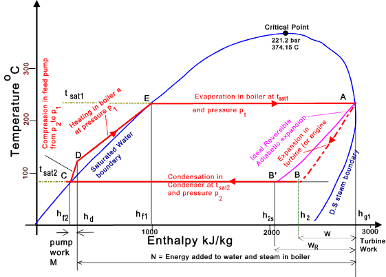 This cycle shows the stages of operation in a turbine plant. The enthalpy reduction in the turbine is represented by A -> B . The reversible process for an ideal isentropic (reversible adiabetic) is represented by A->B'. This enthalpy loss would be (h g1 - h 2 ) in the reversible case this would be (h g1 - h 2s ).
