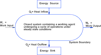 Notes on the internal energy and the total stored energy and its relevance to the first law are provided on webpage Thermodynamic Laws Heat Heat is the energy form which is transferred by a difference in temperature. If a body at 50 deg C is positioned in a fluid at 10 deg C. The fluid temperature rises as heat is transferred from the body. (At the microscopic level the energy possessed as a result of its temperature is kinetic energy of the molecules and atoms.) System In thermodynamics a system is a 3D region in space under study. A system can be an isolated, adiabetic, closed system or an open system and it is surrounded by a defined boundary.. The outside of the boundary is called the surroundings