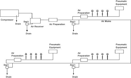 On a large system there may be a main air treatment system on the main header and a individual air treatment system for each group of users. An air treatment system will include an Filter, Lubricator, Isolation Valve, and Pressure Regulator (with gauge) as a minimum.