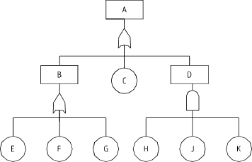 In the above fta logic diagram the intermediate event "B" results if basic events E or F or G occur. The intermediate event D results if basic events H and J and K occur simultaneously. The top fault event results if events B or C or D occur.