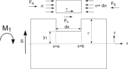 Shear stresses Consider a portion of a beam subject to a moment and a shear force. The beam is assumed to be of rectangular section of uniform width b.