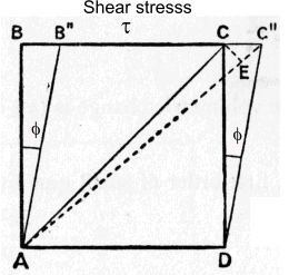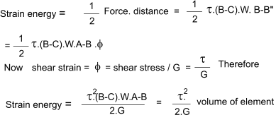 The uniform shear stress on the top surface is τ resulting in a shear strain of φ and a deflection of BB". The stored strain energy =