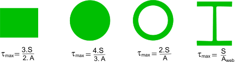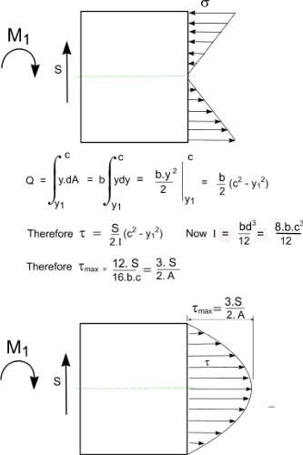 It is clear from the above notes that for a beam subject to shear loading and bending the maximum shear stress is at the neutral axis and reduces to zero at the the outer surfaces wher y1 = ± c . For this section the maximum stress is equal to 3/2 the average shear stress = S / A . The maximum shear stress in other sections are shown below