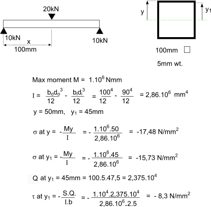 Example. Showing how the shear stress can have an impact on a bending moment calculation is provided below..The maximum bending stress occurs at x = 100mm.