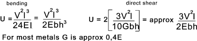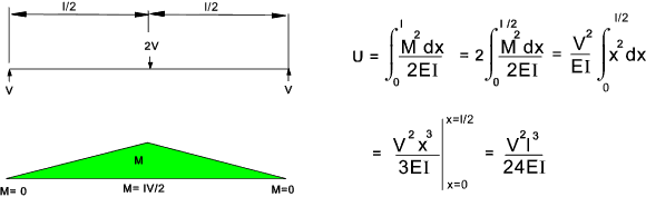 For the simply supported rectangular section beam with a central traverse force of 2V of length l the strain energy due to bending and due to traverse shear as shown below.