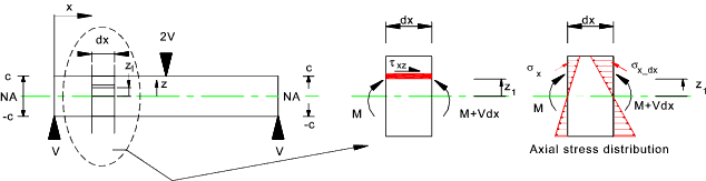 Along the slice dx the axial stress increases to (M + Vdx)z/ I . Thus along the slice dx there is a increase in axial stress of [(Vdx)z] / I.
