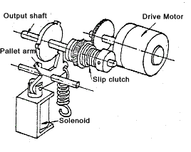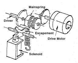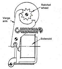 In many machine applications it is desirable to be able to vary the stepping rate. The adjustable rate escapement shown in below resembles the inverse escapement in ****. In the inverse device however the arm is the driver. In the unit shown an electric motor is driving a scape wheel through a slipping clutch. The scape wheel remains at rest until the solenoid is actuated. As one tooth on the pallet arm frees the scape wheel, the other pallet tooth moves to engage the wheel. As a result, the amount of motion is controlled and is independent of the length of the electrical pulse delivered to the solenoid. This mechanism is part of a heavy duty counter. An alternate method of loading the escapement is shown in fig 30. A motor winds a clock sspring from the centre . The outer end of the spring engages a drive pin on the scape wheel which is driven by the spring whenever the solenoid actuates the escapement.