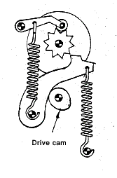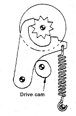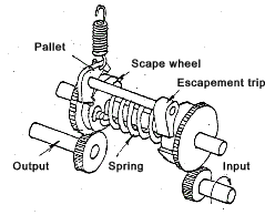 In another type of spring loaded escapement shown below input can be either continuous as shown or intermittent. Output is intermittent and occurs once per revolution of the input cam. In operation, the input winds a spring : continued rotation then releases the spring by triggering an escapement. This is called a "load of fire" escapement and isolates the input from sudden changes in load.M