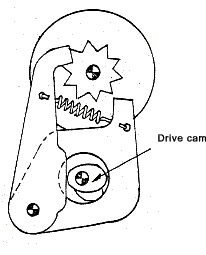 The figure below shows another common machine escapement , input to the escape cam is continuous. The scape wheel is loaded by a stalled motor spring or slip clutch. the type of escapement is really just a holding ring-held plate combination & can be similar to the holding elements used with mutilated gears .