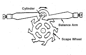 Watch escapments also can be divided into two classifications, friction rest and detached. The figure below illustrates the friction rest type. It is considered a type of cylinder escapement, because the escape member on the pallet is a tiny cylinder and is classed as a friction rest-escapement because the scape wheel drages on the oscillating mass (balance arm) during most of each cycle. A spiral hair spring not show keeps the balance arm oscillating . Teeth of the scape wheel are carefully shaped to deliver a slight impact to the balance arm at every cycle to sustain oscillation while disturbing the balance arm motion as little as possible...