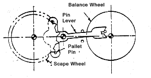 The detached pin lever escapement is shown below is a more sophisticated arrangement. A hairspring coupled to the balance wheel keeps it oscillating. The balance wheel periodically pushes the pin lever ( connecting the scape and balance wheels ) from one side to the other. This push occurs when the balance wheel is passing through the point of maximum kinetic energy. At this point the oscillator is best able to perform work without being distrubed. After the balance wheel has moved the lever however the wheel is free to continue in motion. It generally oscillates about 360 degrees. As a result, the balance wheel oscillator is detached from all restraint during most of its cycle , so the timing accuracy is good.