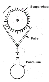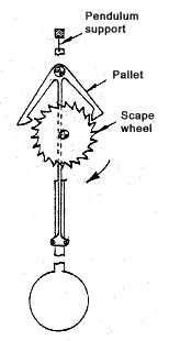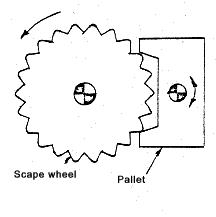 True escapements periodically release a force which drives a load. The force is always trying to drive the load , but cannot do so until the escapement allows. The main flow of power in ratchets and genevas, for example, is through the intermittent motion mechanism: on the other hand an escapement, which is a control device is operated at low power levels even when it is releasing energy from a high-powered source. Runaway Escapement In the type of escapement shown below torque is applied to the scape wheel causing it to rotate. One tooth of the scape wheel encounters on arm of the pallet and the pallet is pushed aside. Rotation of the pallet in turn , frees this tooth, simultaneously bringing the alternate pallet arm into interference position with a second tooth. The pallet and scape wheel are mounted on close centres so that one arm or the pallet will always interfere with the motion of the scape wheel. As the wheel rotates its movement is arrested by repeated (periodic) impact with the pallet. Thus the wheel can rotate only when and as the pallet is free to oscillate.