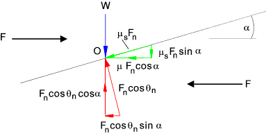 Summing the forces in the vertical direction results in. Fn cos θncos α = W + Ff sin α The coefficient of friction for the screw surface materials is μs : Ff = μs.Fn and therefore. Fn = W / ( cosθncos α - μs.sin α )..........Equation A Summing the moment of the forces around the centerline of the screw to obtain TR , the torque to raise the load W up the incline of the screw. T R = F.r m = r m.(F f cos α + F n cos θnsin α ) = r m.(μs.F n. cos α + F n cos θnsin α ) There is an additional friction torque resulting from the friction force on the thrust collar see top sketch above. This friction force = μc. W. ( μc = coefficient of friction between the screw thrust surface and the collar surface.). This friction torque is assumed to be acting at the thrust collar mean radius rmc T R = r m.(μ s.F n cos α + F n cos θnsin α ) + rmc.μc. W Substituting for Fn.. see equation A above and replacing rm by dm/2 ..( and rmc by dmc /2 )