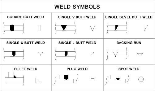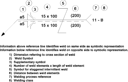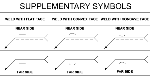 ![]() Note: Weld symbols on the full reference line relates to welds on the near side of the plate being welded. Weld symbols on the dashed line relates to weld on the far side of the plate. If the welds are symmetrical on both sides of the plate the dashed line is omitted. If the dashed line is above the full line then the symbol for the nearside weld is drawn below the reference line and the symbol for the farside weld is above the dashed line. For example see sketch below Supplemetary symbols below. More Detailed Symbolic Representation of Weld ![]() Welding.....Weld process numbers. Table of Weld Symbols ![]() SupplementarySymbols The weld symbols below are used in addition to the primary weld symbols as shown above. They are not used on their own.