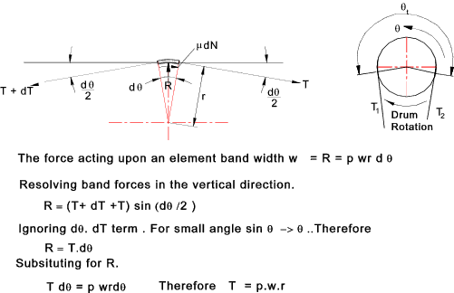 The maximum tension in a belt is provided by the formula below. T1_max = pmax.w.r Differential Band Brake The differential band brake as shown below can be configured to be self energising and can be arranged to operate in either direction..