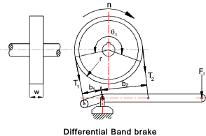 For the Normal Band Brake arrangement shown the relationship between the actuating force and the slack side belt tension is Fi = T2 . b /a Brake Torque CapacityThe torque capacity of the band brake = M = (T1 - T2 ) r Maximum Belt Tension