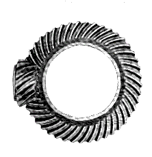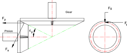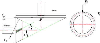 α n = Normal Pressure angle.. Pinion Thrust F p = F t [ (tan α n sin ε / cos γ ) ± tan g cos ε ] Note: ( + ) if helix angle is as shown and ( -) if helix angle is opposite to that shown Hypoid Bevel Gear Hypoid gears are best for the applications requiring large speed reductions with non intersecting shafts and those applications requiring smooth and quiet operation. Hypoid gears are generally used for automotive applications. The minimum number of teeth for speed ratios greater than 6 :1 is eight although 6 teeth pinions can be used for ratios below 6:1. Hypoid gears have pressure angles between 19 and 22o. The design of hypoid gears is relatively specialised and they are manufactured using special "Gleason" machine tools..