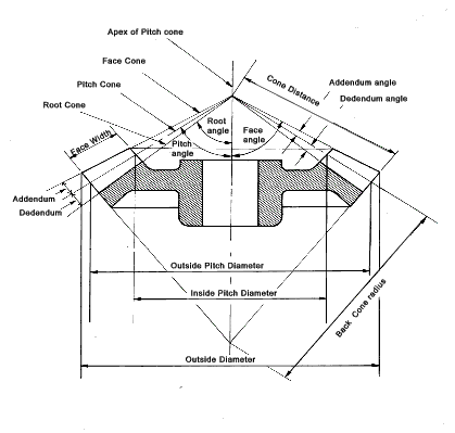 Specifications BS 545:1982..Specification for bevel gears (machine cut)..(Obsolescent) Straight bevel gears These are gears cut from conical blanks and connect intersecting shaft axes. The connecting shafts are generally at 90o and sometimes one shaft drives a bevel gear which is mounted on a through shaft resulting in two output shafts. The point of intersection of the shafts is called the apex and the teeth of the two gears converge at the apex. The design of bevel gears results in thrust forces away from the apex. With the bearing limitations the gears have to be carefully designed to ensure that they are not thrown out of alignment as they are loaded. Straight Bevel Gear Terminology