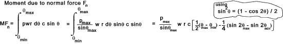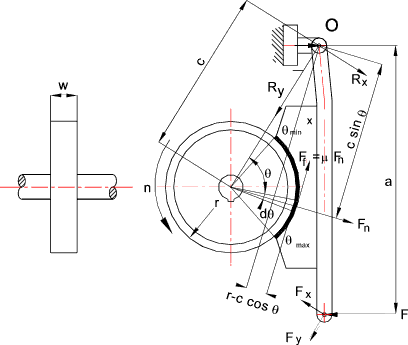 Taking moments about the lever pivot point, the maximum operating force = F i = Fn(b - μc) / a The system as drawn is to some extent self energising because the friction force reduces the actuating force necessary. If the pivot point is located below the brake contact point the brake would not be self sustaining The long block pressure distribution calculation assumes that the lever arm is rigid and the pressure is directly related to the distance from the pivot point. The pressure is proportional to c sin θ or p = k sin θ where k is some constant. For a specific brake material the maximum pressure = pmax. k = p max /sin θ max... and... p = sin θ(p max /sin θ max) The value of minimum θ is usually set to above 100 and the maximum pressure when the value of sin θ is 900. above this angle the pressure reduces. Therefore if the maximum value of θ is less than 900 the sin θ max = sin θ. if the maximum angle is greater than 900 then sin θ max = sin 900
