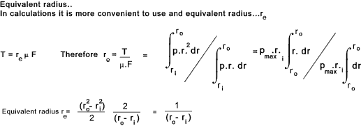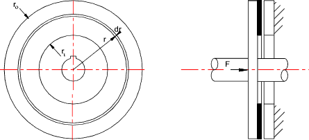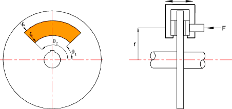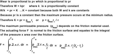 The wear (W)at any location on a brake is assumed to be proportional to the pressure intensity (p)and the associated relative velocity (v)of the local ring of contact.