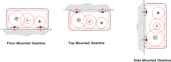 The normal method of fixing an enclosed gearbox in industry is to mount it on a rigid horizontal baseplate designed to absorb vibration. The rotary motion is transferred to the input shaft and from the output shafts via flexible couplings. There are a number of variations as listed below