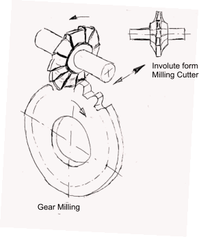 An involute form milling cutter with teeth shaped which conform to the tooth space are used to cut involute gear teeth. This is generally completed on a horizontal milling machine This process has a theoretical disadvantage that the tooth space profile is clearly different for gears having different modules and different number of teeth. This limitation is such that, for each module, by allowing some innaccuracy of form, about eight cutters are needed for the whole range for gear teeth from 10 teeth to the rack form. Milling is limited to making single gears for prototype or very small batches of gears as it is a very slow and uneconomical method of production.