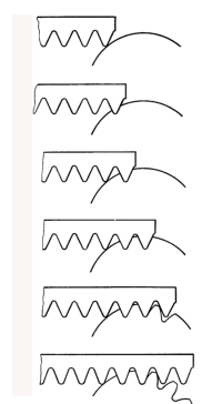 The rack cutter is reciprocated across the blank-face . After each cut the rack cutter a is moved a small distance along the line of teeth and the blank is rotated through a small angle. This is repeated until the end of the rack is reached, at which point the rack and blank have to be repositioned.
