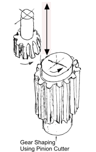 Gear shaping using pinion shaped teeth can be used to produce external and internal gears and splines. The disadvantage of this method is that the generated gear profile is directly dependent of the tooth profile any error on any tooth of the cutter is directly transferred to the gear being cut.