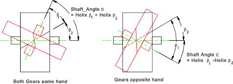 When two helical gears are used to transmit power between non parallel, non-intersecting shafts, they are generally called crossed helical gears. These are simply normal helical gears with non-parallel shafts. For crossed helical gears to operate successfully they must have the same pressure angle and the same normal pitch. They need not have the same helix angle and they do not need to be opposite hand. The contact is not a good line contact as for parallel helical gears and is often little more than a point contact. Running in crossed helical gears tend to marginally improve the area of contact. E = (Same Helix Angle) β 1 + β 2 ......(Opposite Helix Angle) β 1 - β 2