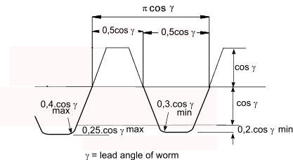h f.1 = Worm Thread dedendum , min = m.(2,2 cos γ - 1 ) , max = m.(2,25 cos γ - 1 )(mm)