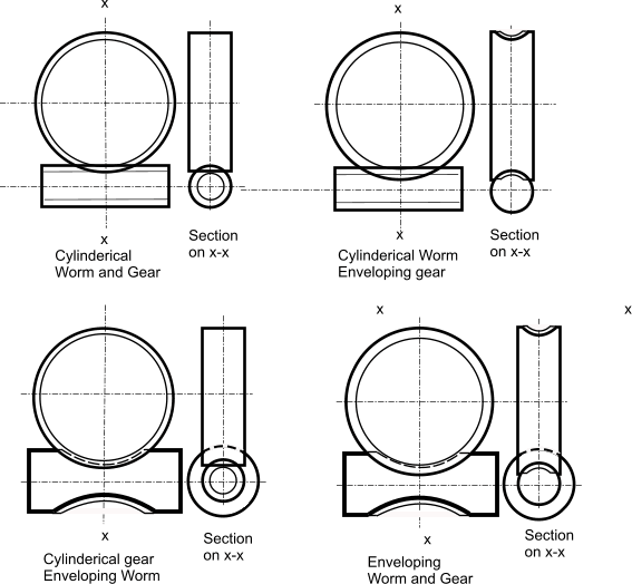 If the worm gears are machined basically as crossed helical gears the result is a highly stress point contact gear. However normally the wormwheel is cut with a concave as opposed to a straight width. This is called a single envelope worm gearset. If the worm is machined with a concave profile to effectively wrap around the wormwheel the gearset is called a double enveloping worm gearset and has the highest power capacity for the size. Single enveloping gearsets require accurate alignment of the worm-wheel to ensure full line tooth contact. Double enveloping gearsets require accurate alignment of both the worm and the wormwheel to obtain maximum face contact.