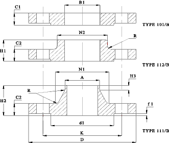 | DN = Nominal size, D = Outside Diameter, A = Outside Dia of Neck , B1 = Bore of Type 101 & 112 Flange, C1 = Thickness of Plate Flange, C2 = Thickness of Weld_Neck and Boss Flange , N1 = Dia of Weld Neck , N2 = Dia of Boss, R = corner Radius, H1 = Length of Boss Flange, H2 = Length of Weld Neck Flange, H3 = Length of Neck : Note: The flanges shown are only a small part of the range covered in BS 4504. The Facings shown are type B (Raised Face). Other Facings include: Type A..Flat: Type C..Tongue: Type D..Groove Type E..Spigot: :Type F..Recess: Type G..O-ring Recess: Type H.,0-ring Groove: |